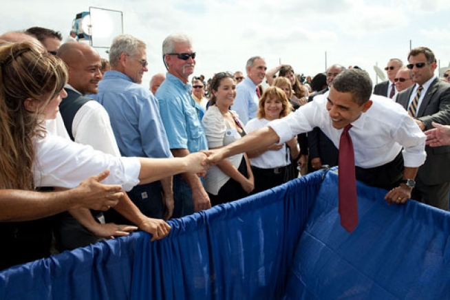 (President Barack Obama reaches to shake hands with people in the crowd following a tour and remarks at the DeSoto Next Generation Solar Energy Center in Arcadia, Fla., Oct. 27, 2009. Official White House Photo by Pete Souza)