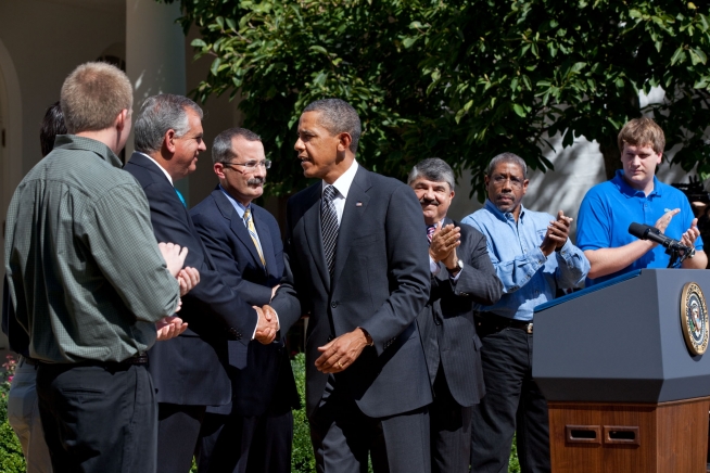 President Barack Obama shakes hands with Transportation Secretary Ray LaHood after a statement calling on Congress to move forward in a bipartisan way to pass a clean extension of the Surface Transportation Bill, and a clean extension of the Federal Aviation Administration Reauthorization, in the Rose Garden of the White House, Aug. 31, 2011. Pictured, from left are: Chris Negley, Senior Inspector, KCI Technologies; Adam Vencill, Senior Inspector, KCI Technologies (obscured); Secretary LaHood; David Chavern, Executive Vice President and COO, Chamber of Commerce; the President; Richard Trumka, President, AFL-CIO; Hector Sealey, Safety Director, Ft. Myer Construction Corporation; and Austin Anderson, Project Manager, Ft. Myer Construction Corporation. (Official White House Photo by Pete Souza)
