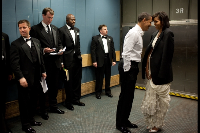 “We were on a freight elevator headed to one of the Inaugural Balls. It was quite chilly, so the President removed his tuxedo jacket and put it over the shoulders of his wife. Then they had a semi-private moment as staff members and a Secret Service agent tried not to look.”