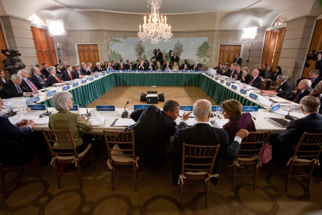 President Barack Obama discusses a point with House Speaker Nancy Pelosi (D-Calif.) during the health insurance reform legislation meeting at Blair House in Washington, D.C., Feb. 25, 2010. (Official White House Photo by Lawrence Jackson)