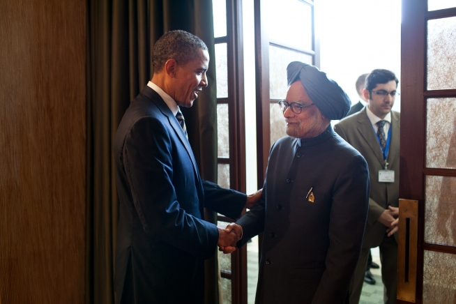 President Barack Obama greets Prime Minister Manmohan Singh of India at the start of their bilateral meeting at the ASEAN Summit in Nusa Dua, Bali, Nov. 18, 2011. (Official White House Photo by Pete Souza)