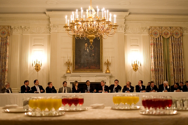 Feb. 10, 2009: The President meets with the Democratic Blue Dog coalition in the State Dining Room of the White House.