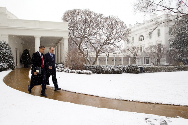 Jan. 27, 2009: President Obama leaves the White House with his legislative affairs director Phil Shiliro en route to the U.S. Capitol to meet with the Republican caucuses.