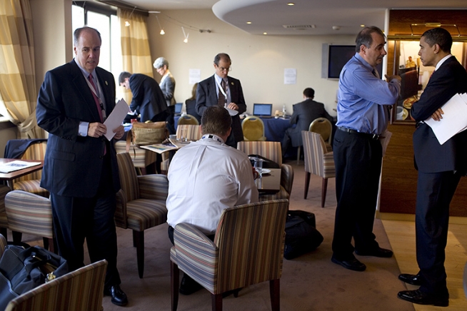 President Barack Obama speaks with White House Senior Advisor David Axelrod in the staff work room April 4, 2009, in Strasbourg, France.