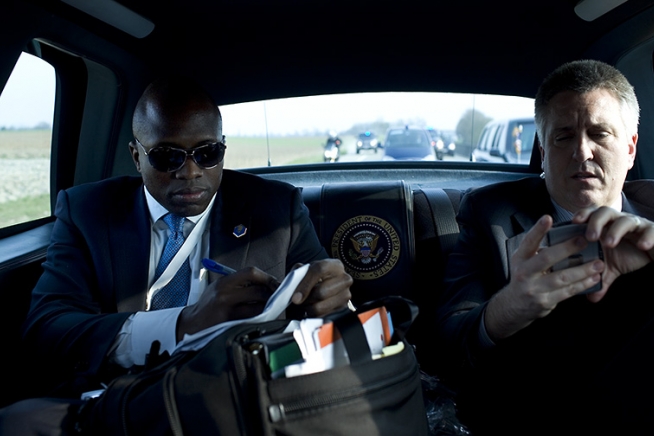 President Barack Obama's personal aide Reggie Love, left, and White House physician Dr. Jeffrey Kuhlman check their notes as they travel in the Presidential motorcade April 4, 2009 in Strasbourg, France.