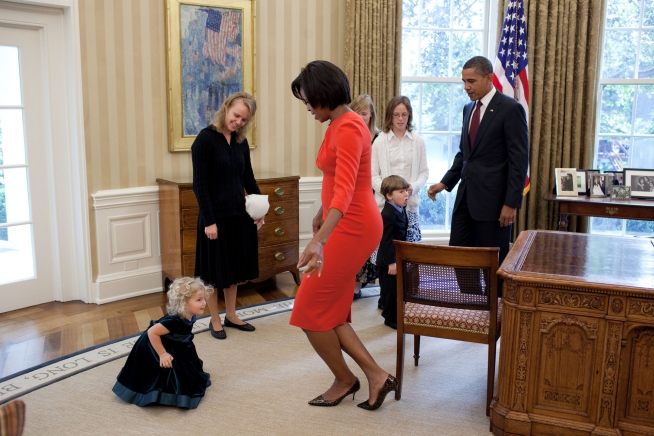 First Lady Michelle Obama curtsies with Lynne Silosky, a niece of posthumous Medal of Honor awardee, Staff Sergeant Robert J. Miller,
