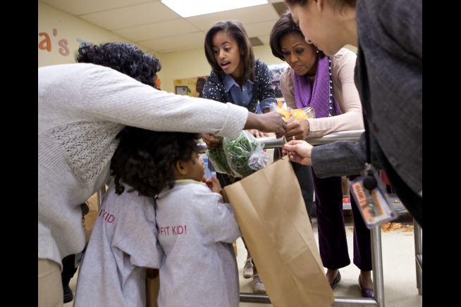 First Lady Michelle Obama and daughter Malia distribute various Thanksgiving food items to members of the community at Martha’s Table, a food pantry in Washington, D.C., Nov. 24, 2010. (Official White House Photo by Samantha Appleton)