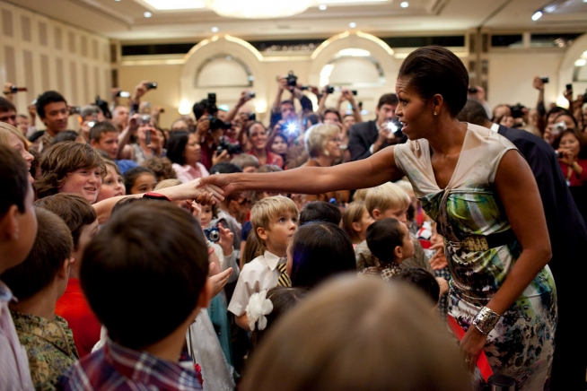 President Barack Obama and First Lady Michelle Obama greet children during a meeting with the U.S. Embassy staff at the Shangri-La Hotel in Jakarta, Indonesia, Nov. 10, 2010. (Official White House Photo by Pete Souza)