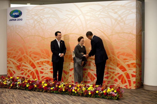 President Barack Obama is greeted by Prime Minister Naoto Kan and Mrs. Kan prior to the APEC dinner at the Pacifico Yokohama Conference Center in Yokohama, Japan, Nov. 13, 2010. (Official White House Photo by Pete Souza)