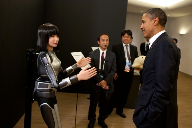 President Barack Obama observes the Cybernetic Human Robot prior to the start of the APEC dinner at the Pacifico Yokohama Conference Center in Yokohama, Japan, Nov. 13, 2010. (Official White House Photo by Pete Souza)