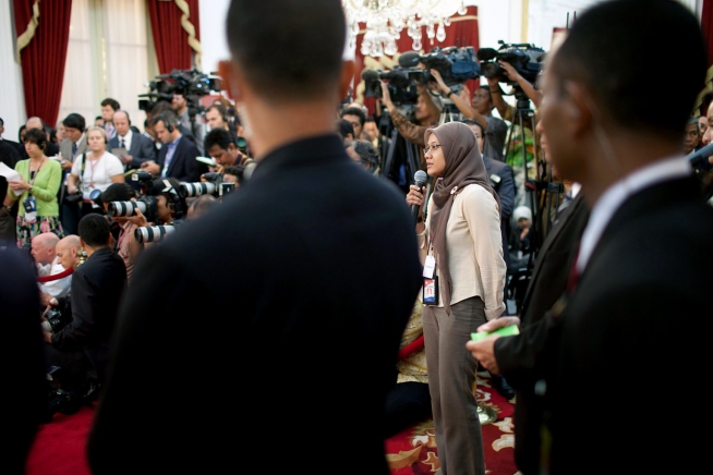A woman poses a question to President Barack Obama and President Susilo Bambang Yudhoyono during a press conference at the Istana Merdeka State Palace Complex in Jakarta, Indonesia, Nov. 9, 2010. (Official White House Photo by Pete Souza)