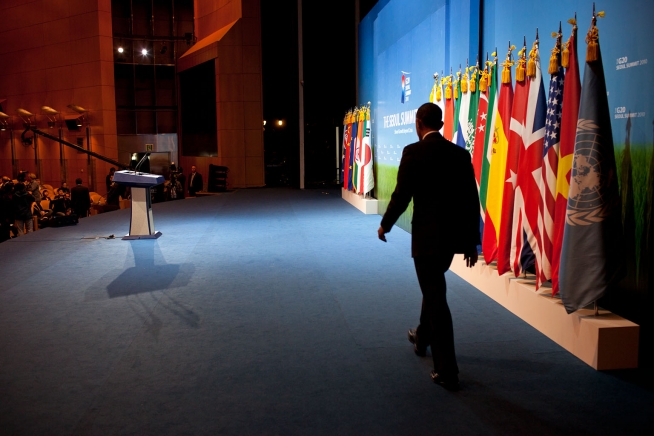 President Barack Obama walks on stage for a press conference at the G-20 Summit at the Coex Center, in Seoul, South Korea, Nov. 12, 2010. (Official White House Photo by Pete Souza)