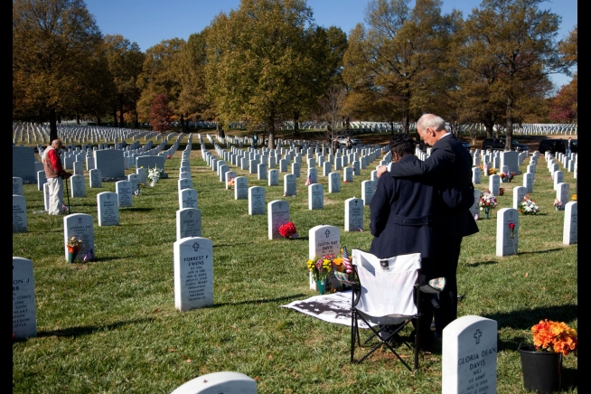 Vice President Joe Biden talks to a family member of a soldier in Section 60, where troops from Afghanistan and Iraq are buried, at Arlington National Cemetery in Arlington, Va., Nov. 11, 2010. (Official White House Photo by David Lienemann)