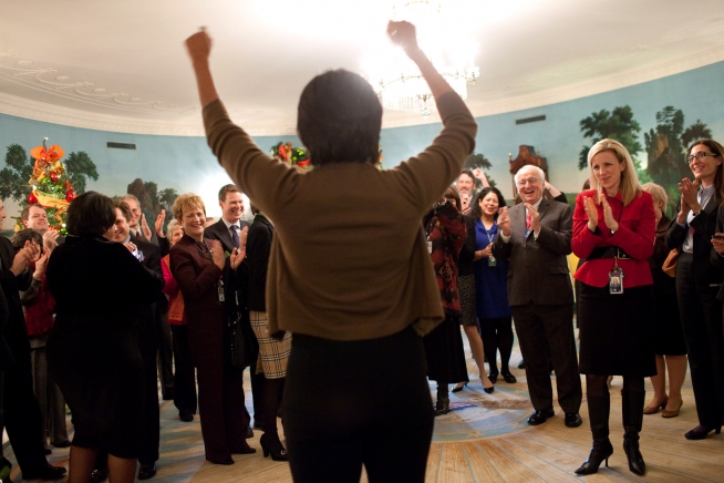 First Lady Michelle Obama greets guests during a Child Nutrition Reauthorization Bill reception in the Diplomatic Reception Room of the White House, Dec. 13, 2010. (Official White House Photo by Samantha Appleton)