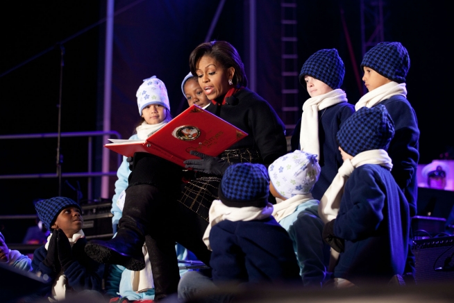 First Lady Michelle Obama reads "The Night Before Christmas" to a group of children during the National Christmas Tree Lighting ceremony on the Ellipse in Washington, D.C., Dec. 9, 2010. (Official White House Photo by Chuck Kennedy)