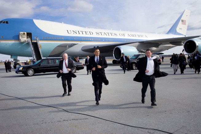 President Barack Obama jogs across the tarmac to shakes hands with people gathered to watch his arrival on Air Force One at Piedmont Triad International Airport in Greensboro, N.C., Dec. 6, 2010. (Official White House Photo by Pete Souza)