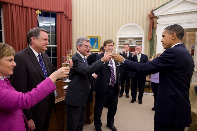 President Barack Obama shares a toast in the Oval Office with the members of his National Security Staff who worked on the New START nuclear arms control agreement, Dec. 22, 2010. (Official White House Photo by Pete Souza)