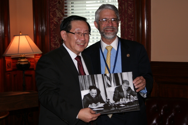 OSTP Director John P. Holdren and the Minister of Science and Technology for the People’s Republic of China Wan Gang hold a photograph of U.S. President Jimmy Carter and Chinese Premier Deng Xiaoping signing the original U.S.-China Agreement on Cooperation in Science and Technology in 1979.