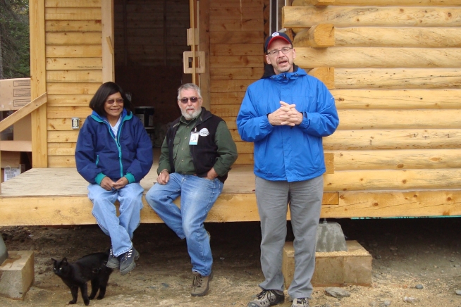 From left, disaster survivor Mary Rose David with Harold Miller of Mennonite Disaster Services and David Myers, director of the recently renamed DHS Center for Faith-based & Neighborhood Partnerships at the dedication of her newly rebuilt home in Eagle, Alaska. FEMA/Jack Heesch.