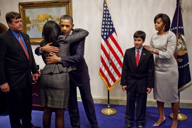 President Barack Obama and First Lady Michelle Obama greet the Green family after the State of the Union address at the U.S. Capitol in Washington, D.C., Jan. 25, 2011. John and Roxanna Green are the parents of eleven-year-old Dallas and the late Christina Taylor, the nine-year-old girl killed when a gunman opened fire on Rep. Gabrielle Giffords in Tucson earlier this month. (Official White House Photo by Pete Souza)