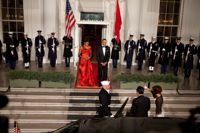 President Barack Obama and First Lady Michelle Obama welcome President Hu Jintao of China at the North Portico of the White House for the State Dinner, Jan. 19, 2011. (Official White House Photo by Chuck Kennedy)