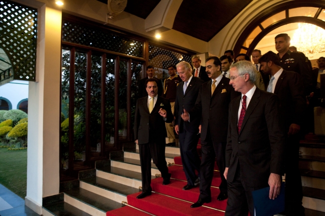 Vice President Joe Biden walks with PrIme Minister Raza Gilani and Interior Minister Rehman Malik, left, after making a joint statement to the press in Islamabad, Pakistan, Jan. 12, 2011. (Official White House Photo by David Lienemann)