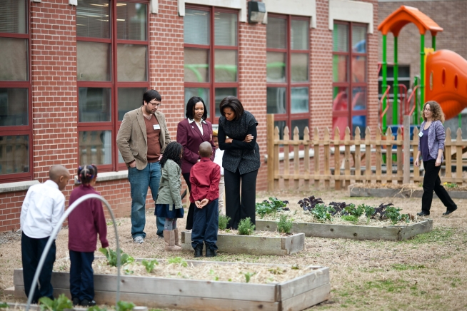 First Lady Michelle Obama examines garden boxes during a tour of the courtyard garden at Burgess-Peterson Academy in Atlanta, Ga., Feb. 9, 2011. (Official White House Photo by Lawrence Jackson)