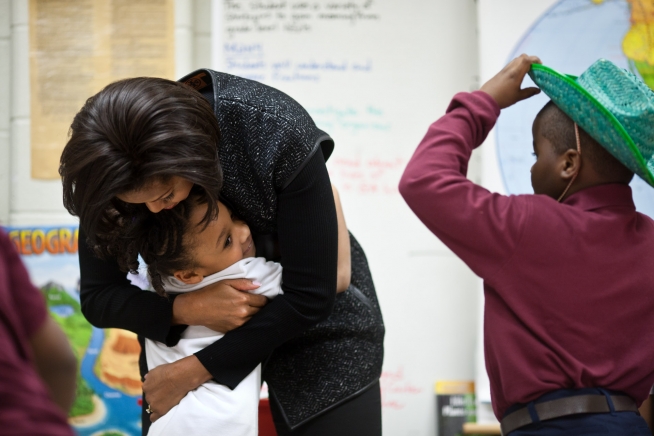 First Lady Michelle Obama hugs a student as she arrives at Burgess-Peterson Academy in Atlanta, Ga., Feb. 9, 2011. The First Lady visited the school to highlight how it is working with children to promote healthy eating, bringing the principles of "Let’s Move!" to life through gardening and healthy eating programs. (Official White House Photo by Lawrence Jackson)