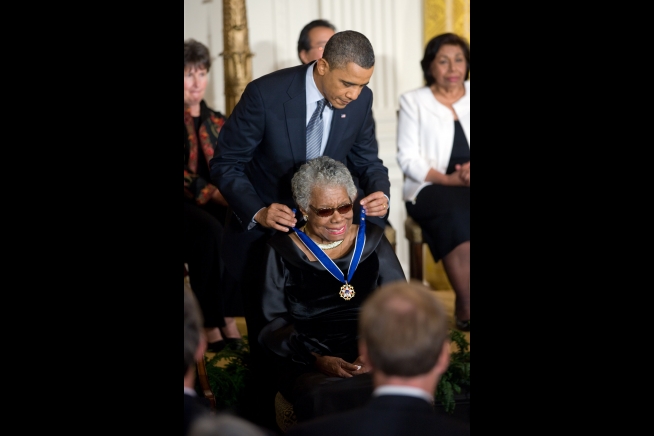 President Barack Obama awards the 2010 Presidential Medal of Freedom to Dr. Maya Angelou in a ceremony in the East Room of the White House