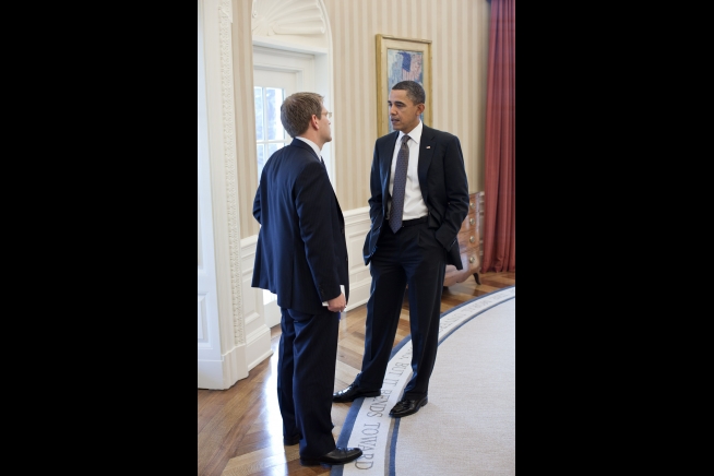 President Barack Obama talks with Press Secretary Jay Carney in the Oval Office, Feb. 17, 2011. (Official White House Photo by Pete Souza)