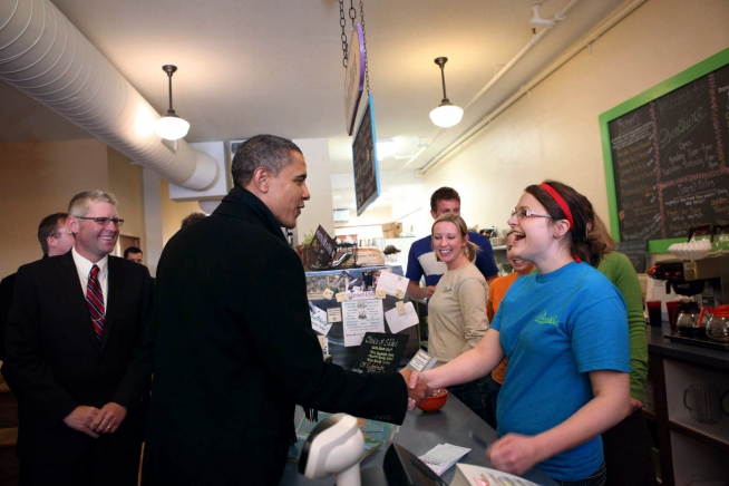 President Barack Obama greets the employees during a stop at Donkers candy store and restaurant in Marquette, Mich.,