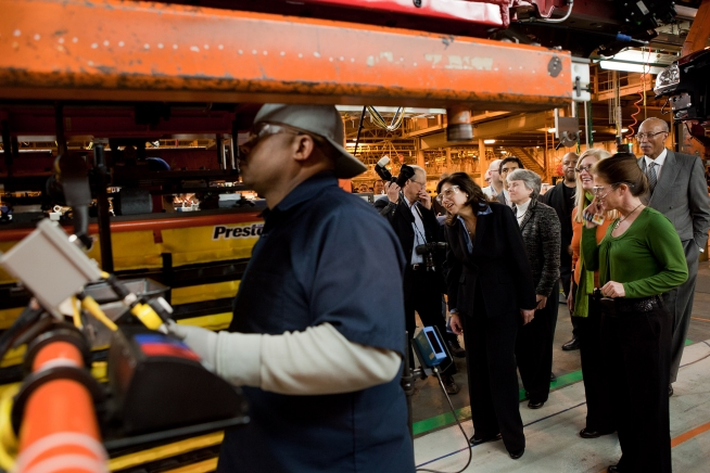 Secretary of Labor Hilda Solis watches as workers marry the drivetrain to the body of a Chevy Volt electric plug-in car during a tour of the Detroit Hamtramck Assembly Plant in Detroit, Mich., Feb. 7, 2011. (Official White House Photo by Samantha Appleton)