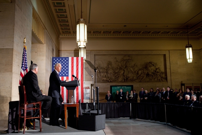 Vice President Joe Biden and Secretary of Transportation Ray LaHood deliver remarks on building a 21st century infrastructure at 30th Street Station in Philadelphia, Pennsylvania, February 7, 2011. (Official White House Photo by David Lienemann)