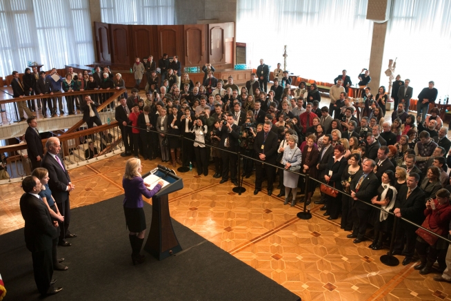 Dr. Jill Biden introduces Vice President Joe Biden to U.S. Embassy staff in Chisinau, Moldova, March 11, 2011. (Official White House Photo by David Lienemann)