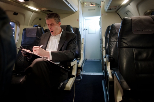 Secretary of Education Arne Duncan works during a commercial flight from Los Angeles to San Diego, Calif., March 22, 2011. (Official White House Photo by Chuck Kennedy)