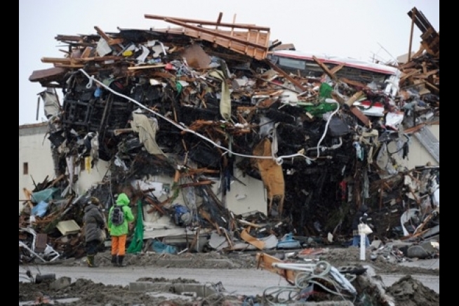 Local residents look at a mountain of debris left by the March 11 tsunami and earthquake in Natori in Miyagi Prefecture on March 16, 2011. Photo credit: Toru Yamanaka / AFP