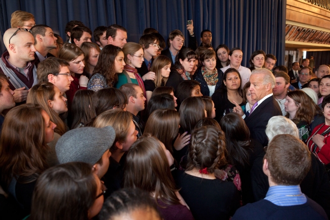 Vice President Joe Biden talks with Peace Corps volunteers in Chisinau, Moldova, March 11, 2011. (Official White House Photo by David Lienemann)