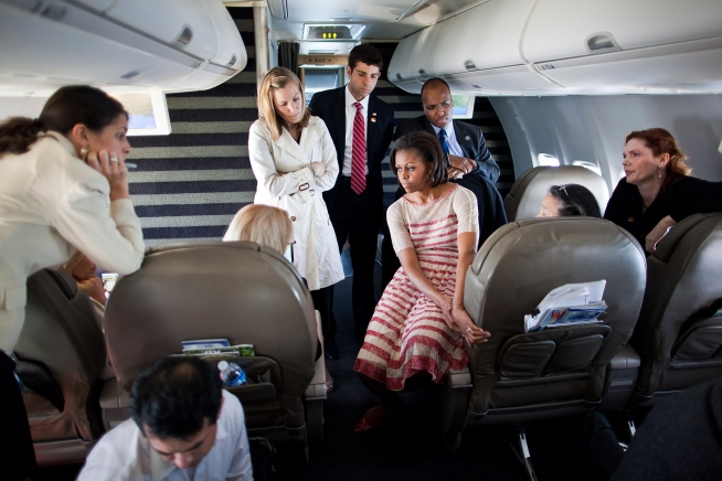 First Lady Michelle Obama and Dr. Jill Biden are briefed aboard Bright Star during a flight from New River Marine Corps Air Station in North Carolina to Lackland Air Force Base in San Antonio, Texas, April 13, 2011. (Official White House Photo by Chuck Kennedy)