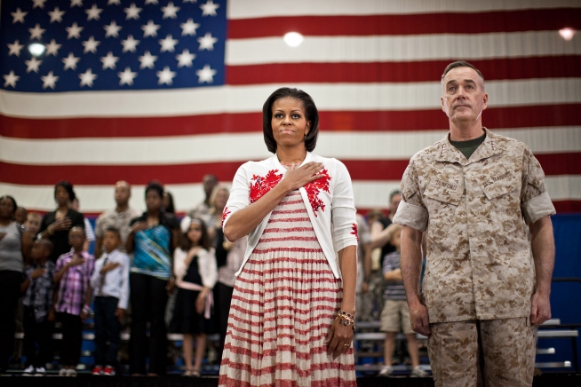 First Lady Michelle Obama and Gen. Joseph Dunford stand during the national anthem during a military community event at Memorial Field House at Camp Lejeune, N.C., April 13, 2011. The First Lady and Dr. Biden spoke to 3,000 Marines, soldiers, sailors, and military family members from Camp Lejeune, one of the country's largest Marine Corps bases. (Official White House Photo by Chuck Kennedy)