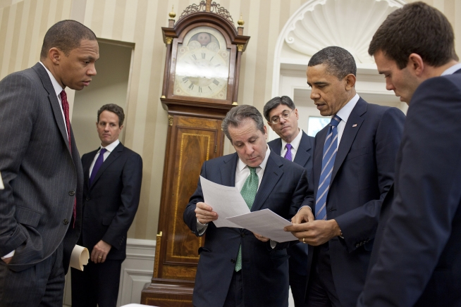 President Barack Obama reviews his fiscal policy speech with advisors in the Oval Office, April 13, 2011. Pictured, from left, are: Rob Nabors, Assistant to the President for Legislative Affairs; Treasury Secretary Timothy Geithner; National Economic Council Director Gene Sperling; Office of Management and Budget Director Jack Lew; and Director of Speechwriting Jon Favreau. (Official White House Photo by Pete Souza)