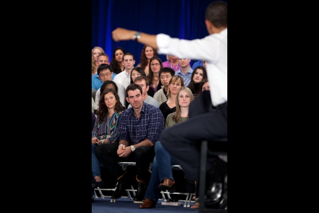 Members of the audience listen as President Barack Obama participates in a town hall meeting moderated by CEO Mark Zuckerberg at Facebook headquarters in Palo Alto, Calif.