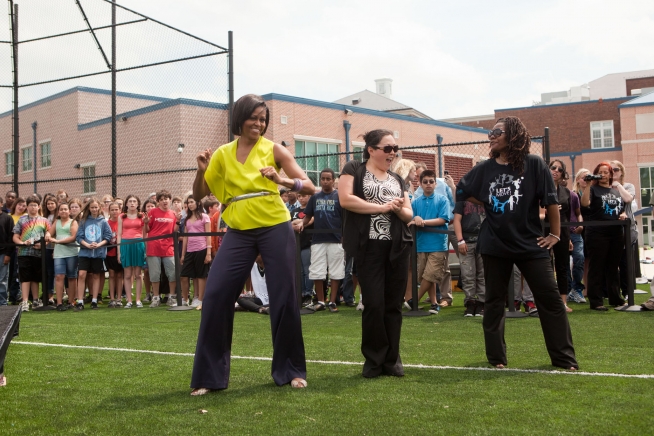 First Lady Michelle Obama dances during a Flash Mob Dance at Alice Deal Middle School in Washington, D.C.,