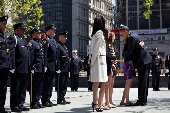 President Barack Obama greets 14-year old Payton Wall at the site of the National September 11th Memorial and Museum at Ground Zero in New York, N.Y., May 5, 2011. The President received a letter from Wall, who lost her father in the World Trade Center attack, and asked that she be invited to the ceremony. Standing with Wall are her mother Diane, her sister Avery, and friend Madison Robertson, who also lost her father on 9/11. (Official White House Photo by Pete Souza)