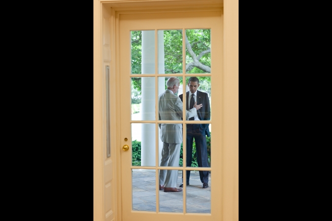 President Barack Obama talks with Vice President Joe Biden on the Colonnade of the White House outside the Oval Office, June 20, 2011. (Official White House Photo by Pete Souza)