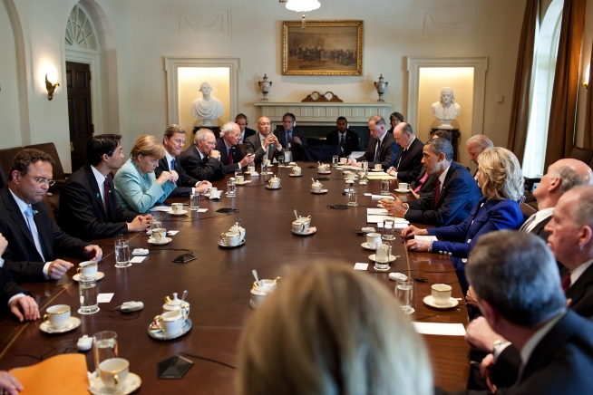 President Barack Obama holds a bilateral meeting with Chancellor Angela Merkel of Germany in the Cabinet Room of the White House, June 7, 2011. (Official White House Photo by Pete Souza)