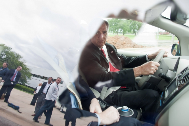 Transportation Secretary Ray LaHood test drives a Leaf EV, Nissan’s 100% electric vehicle, at the Nissan Automotive Plant in Smyrna, Tenn., May 17, 2011. The plant is being re-equipped to turn out 150,000 LEAF EVs a year. Together with the new battery plant, the facilities are expected to create 1,300 new jobs. (Official White House Photo by Lawrence Jackson)