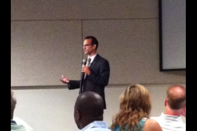 Ben Seigel, deputy director of the Center for Faith-based and Neighborhood Partnerships at the Department of Labor, addresses the full meeting of the Career Network Ministry at McLean Bible Church.