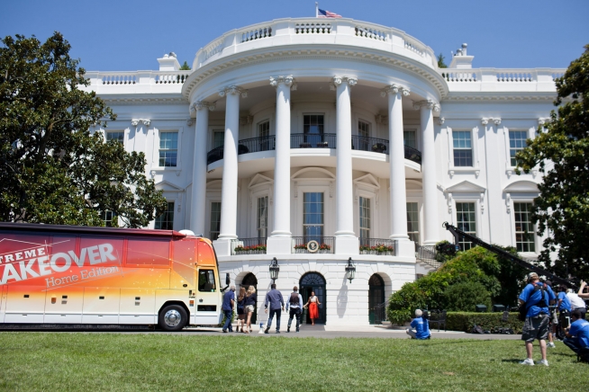 First Lady Michelle Obama films an episode of Extreme Makeover: Home Edition about Joining Forces with Ty Pennington and crew on the South Portico of the White House, July 27, 2011. (Official White House Photo by Samantha Appleton)