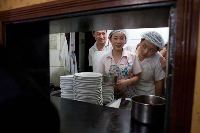 Cooks watch from the kitchen as Vice President Joe Biden has lunch at a traditional Beijing style snack shop, in Beijing, China, Aug.18, 2011. The Vice President dined with his granddaughter Naomi Biden, daughter-in-law Kathleen Biden, U.S. Ambassador Gary Locke and Ambassador Locke's wife Mona. (Official White House Photo by David Lienemann)