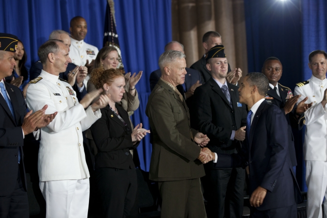 President Barack Obama shakes hands after speaking about the economy and the Administration’s efforts to prepare our nation’s veterans for the workforce at the Washington Navy Yard in Washington, D.C., Aug. 5, 2011, (Official White House Photo by Pete Souza)